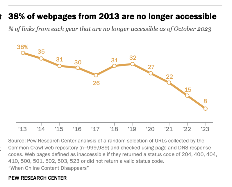 这现象已经被正经研究了,根据 2024 年皮尤中心的报告,在 2013 年存在的网页中,大约 38% 在 10 年后(到 2023 年)已无法访问。换句话说,那些曾经能点开的网页,有近四成在十年间消失了。